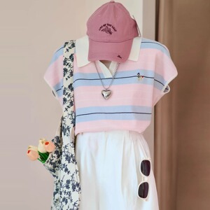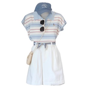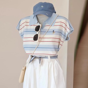 レトロなコントラストストライプポロカラー半袖セーターレディース夏のファッション年齢軽減Tシャツ小さなフライングスリーブカジュアルトップ