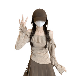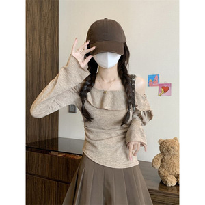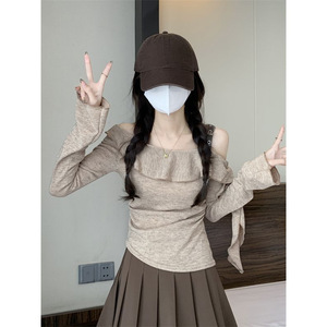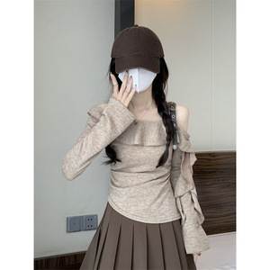 2025年新款荷叶边不规则一字肩T恤女短款长袖修身绝美上衣秋1