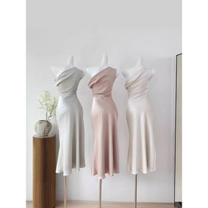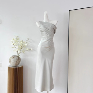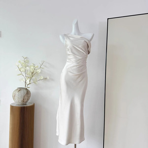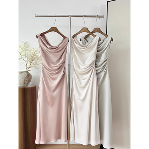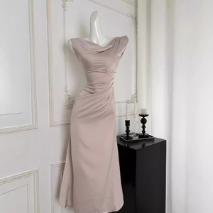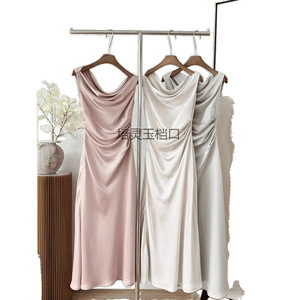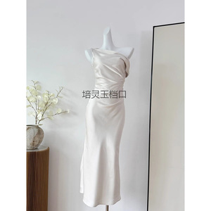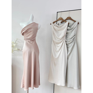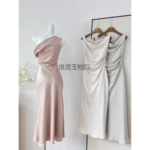 荡领斜肩连衣裙法式气质女三色收腰鱼尾裙2024秋季