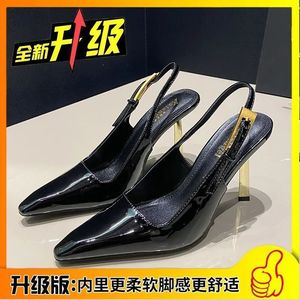高跟鞋女2025年夏季新款镂空黑色尖头气质小金跟漆皮包头细跟凉鞋