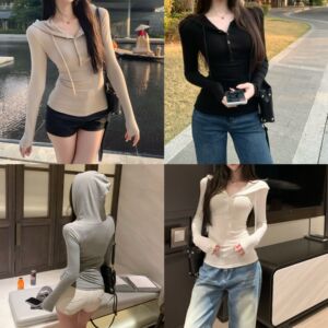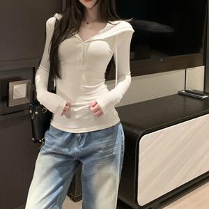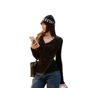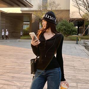 简约美式辣妹修身显身材 半开扣连帽卫衣收腰内搭长袖上衣女黑色