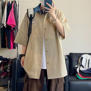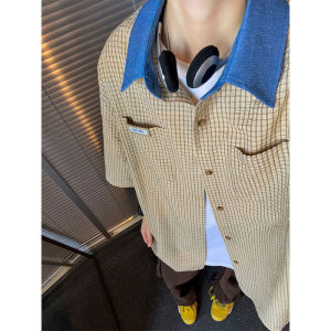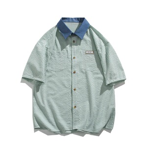 若々しいミントグリーンのチェック柄半袖シャツメンズサマーデニムスプライシングデザインハンサムボーイズシャツ