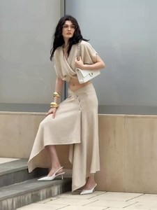 2025 レイジースタイルショートへそ出しミルクティーカラースーツ女性用不規則なハイウエストハーフレングススカートツーピースセット女性用