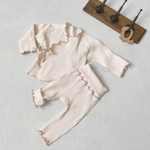 婴儿秋装蝴蝶衣女宝宝棉坑条木耳边长袖和尚服高腰护肚裤睡衣套装