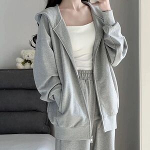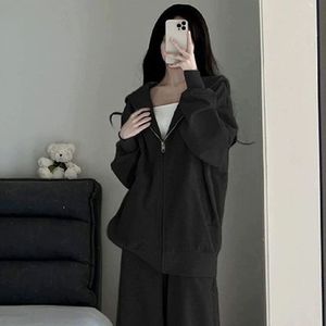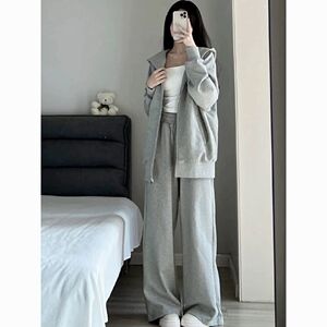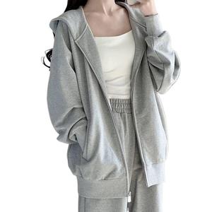 休闲运动套装女秋冬新款宽松连帽灰色卫衣阔腿裤两件套开衫外套潮