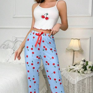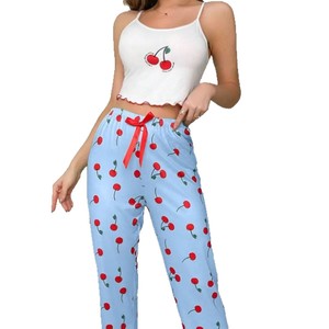 ヨーロッパとアメリカのeBayホットセールミルクシルクセクシーパジャマシンプルカジュアルプリントサスペンダー弾性ズボンホームウェアセット