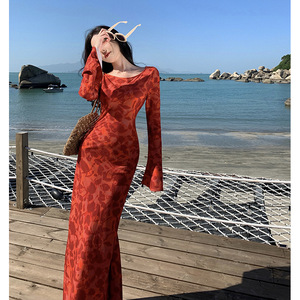 2025新款旗袍女高级感改良新中式连衣裙摩洛哥玫瑰印花长袖连衣裙
