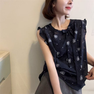 2025 夏の新デザインステッチ耳シャツ女性のファッションリボンラウンドネック薄型ノースリーブトップ