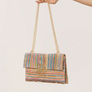 2025年夏のホットアイテム、卸売クロスボーダー商品、レディースリゾート風ストローハンドバッグ、多層チェーン付きフリップトップストローバッグ