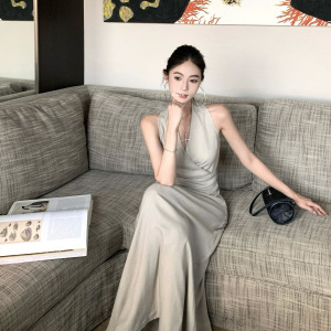 2025年夏 シンプルで優しいクロスVネックベストワンピース レディース エレガントなタイアップウエストAラインロングスカート