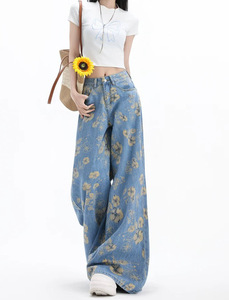 小众花朵扎染阔腿牛仔裤2025年秋款女美式浅蓝宽松垂感高腰拖地裤