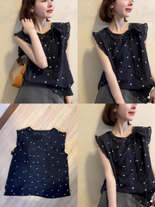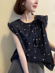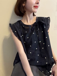 2025 新しい夏の韓国スタイルのスリムなデザイン、ファッショナブルで多用途なラウンドネックラブドットプリントノースリーブシャツ女性用