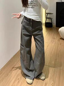 美式深灰色阔腿工装裤女春季新款大码胖mm宽松梨型身材拖地牛仔裤