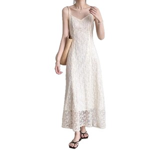 2025 フレンチスタイルの優しいレースサスペンダードレス新しい夏の刺繍花柄スリムで多用途なロングスカート