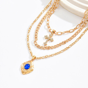 新しいヨーロッパとアメリカのパーソナライズされたニッチブルージェムストーンスクエアペンダントネックレスレトロ多層クロス鎖骨チェーンアクセサリー