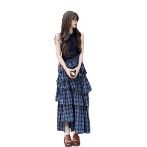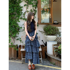 レトロチェック柄パッチワークベストドレス女性のための 2025 夏の新しいウエストデザイン偽ツーピースケーキスカート