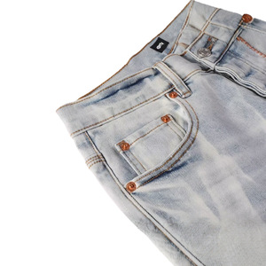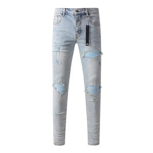 AM外贸跨境潮牌高街青年刺绣徽章破洞牛仔裤弹力紧身小直脚长裤子