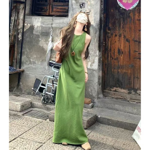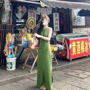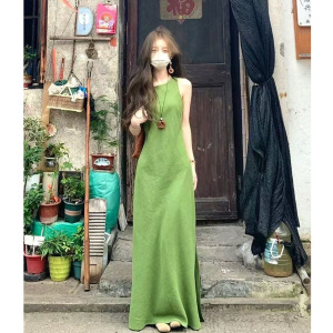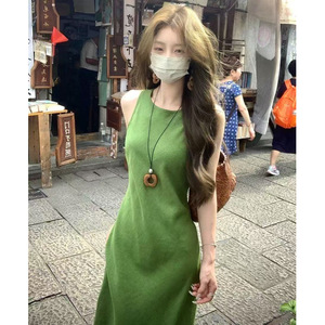 2025复古夏季新款无袖森系绿色连衣裙收腰显瘦背心长裙气质显瘦
