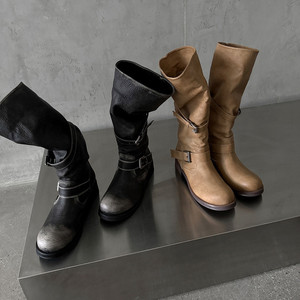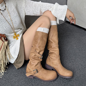 擦色牛皮骑士靴女高筒长靴秋新款圆头中跟套筒皮带扣真皮不过膝靴