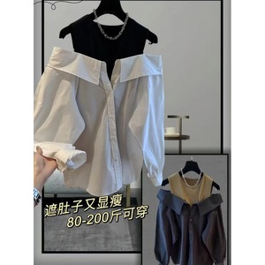 春秋新款大码胖露肩时尚潮流女宽松长袖衬衫外穿假两件上衣露肩