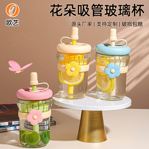女の子向けのストロー蓋付きの見栄えの良いガラス製フラワーストローカップ、シンプルで持ち運び可能な茶水分離フラワーティーカップ