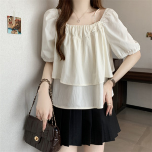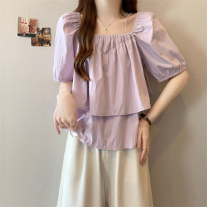 パープルスクエアネック右肩パフスリーブ半袖シャツ女性のための 2025 夏プラスサイズファット mm ベビードールシャツワンショルダートップ