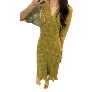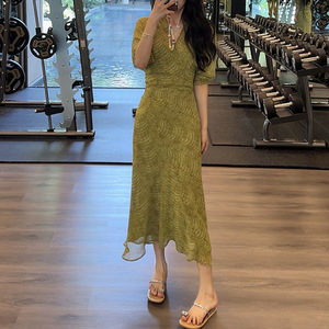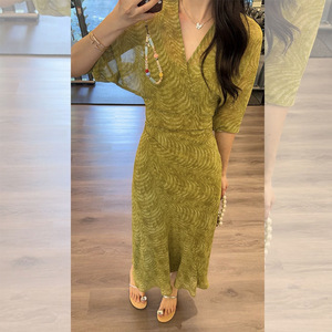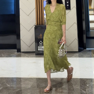 2025夏季新款法式V领中长款绿色显瘦收腰裹身连衣裙内含吊带裙潮