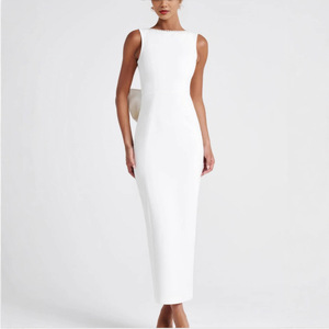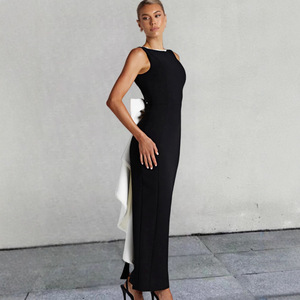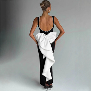 名媛风黑白撞色无袖连衣裙2025年春夏新款辣妹露背珍珠蝴蝶结长裙