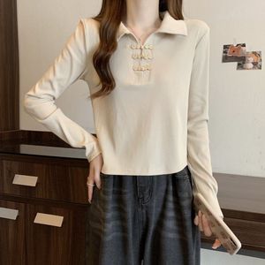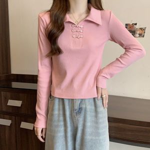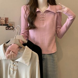 初秋の新しい中国風のショートカラー長袖シャツ女性用、ナショナルスタイルのボタン付き、甘い痩身黒トップ女性用
