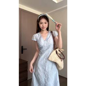 フレンチジェントルスタイルライトブルーVネックかぎ針編みドレスレディース夏の新しいデザインシックな気質ロングスカート