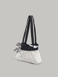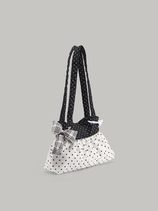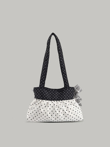 韓国の昔ながらの白黒パッチワークショルダーバッグ、かわいい個性のリボンハンドバッグ、女性用ニッチ水玉トートバッグ