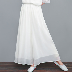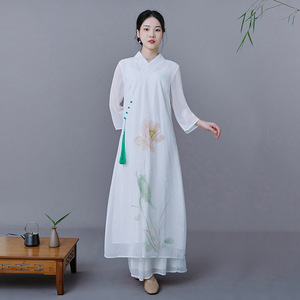 中国風改良レースアップ斜め襟禅茶服文学レトロ長袖シフォンドレスワイドレッグパンツスーツ