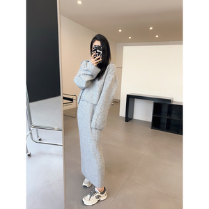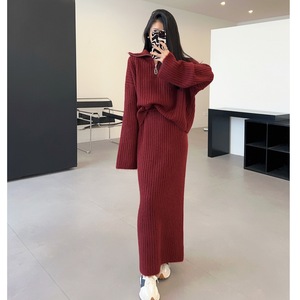 慵懒风半拉链翻领毛衣套装女秋冬季韩版宽松休闲针织半身裙两件套