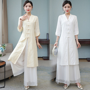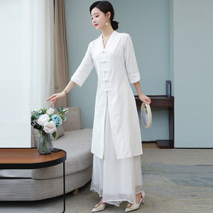 女性用禅服、春夏改良チャイナドレス、中国風文学レトロ綿麻ボタン付きヤングティードレススーツ