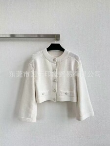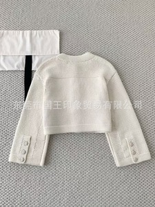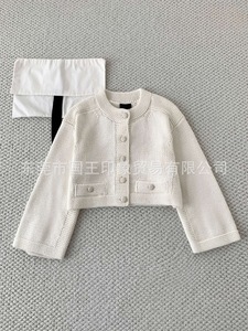 国王印象 早秋新款小香风粗针口袋圆领短款针织长袖开衫外套女