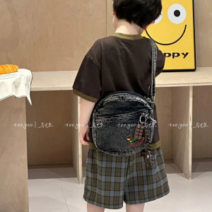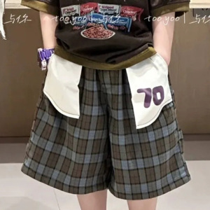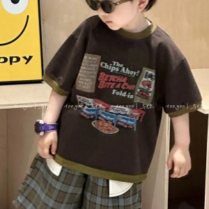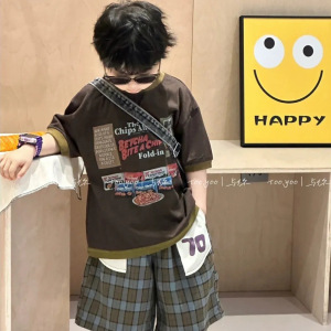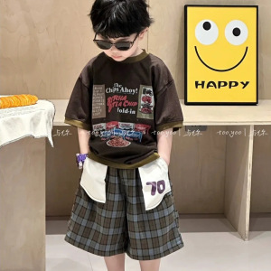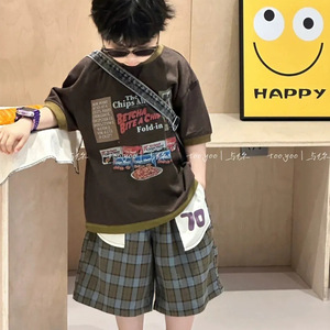 男童夏季短袖套装2025新款时尚印花短袖百搭复古格子七分裤两件套