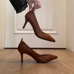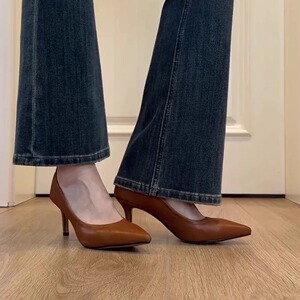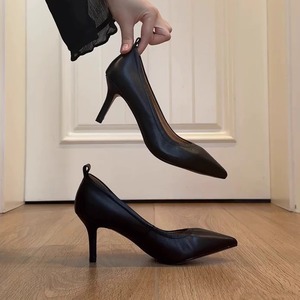 2025春秋季工作鞋摔纹羊皮细跟尖头韩版时尚女鞋浅口高跟鞋女鞋子