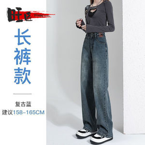 大码窄版阔腿牛仔裤女潮流百搭薄新款复古高腰显瘦直筒拖地长裤子