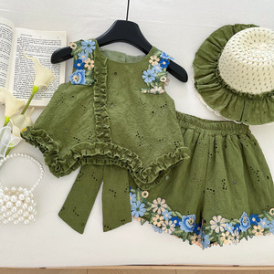 2025夏季新款女童套装花朵露背上衣大蝴蝶结无袖上衣短裤两件套