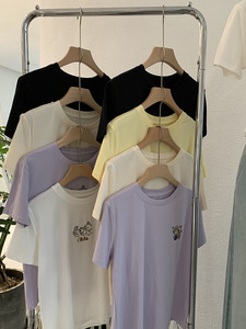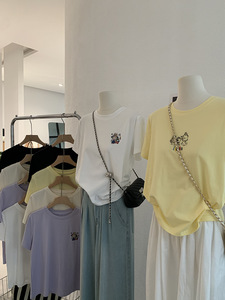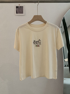 Omalai アニメ漫画刺繍柄ラウンドネック半袖ストレートショルダー Tシャツトップ夏韓国語版女性 4015