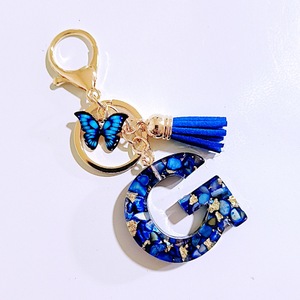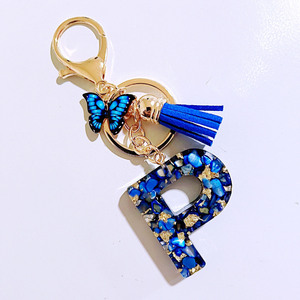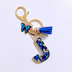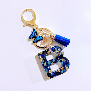 1个宝蓝色滴胶英文字母蝴蝶流苏钥匙扣包饰挂饰跨境热销派对礼品