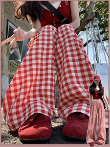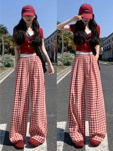 人気の赤いチェック柄パンツ女性の夏 2025 新しいハイウエストルーズ痩身カジュアルパンツドーパミンストレートワイドレッグパンツ