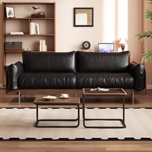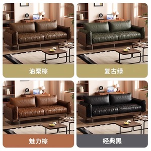 ミッドセンチュリースタイルブラックウォールナット無垢材ソファリビングルーム2025新しいフレンチレトロ本革第一層牛革ストレート列