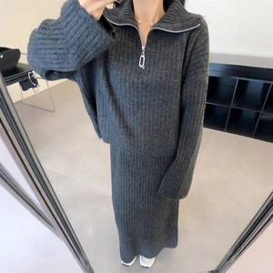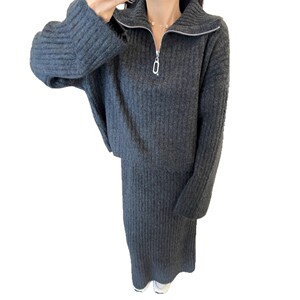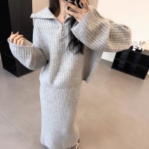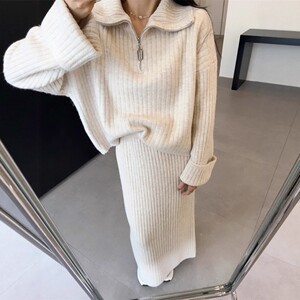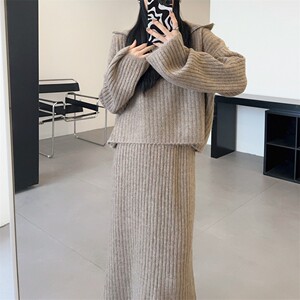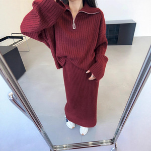 韓国版東大門秋冬新作レイジースタイルソフトワックスルーズラペルジッパーセーターウエストゴムスカートスーツ