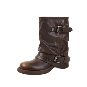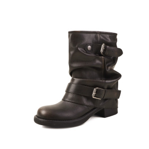 2025复古裤管靴子黑色褶皱西部牛仔靴圆头粗跟皮带扣短筒骑士靴女