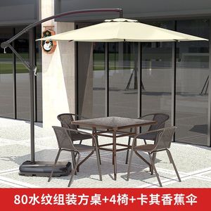 80 ブラック 組み立て済みスクエアテーブル + チェア 4 脚 + カーキ バナナ傘
