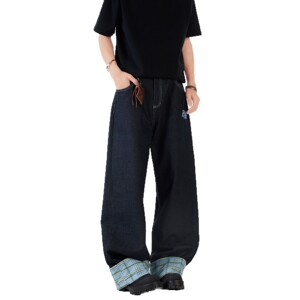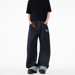 在庫ありの男性と女性用のアメリカンレトロジーンズ、カールエッジステッチワイドレッグパンツ、ハイストリートカップルルーズカジュアルパンツ