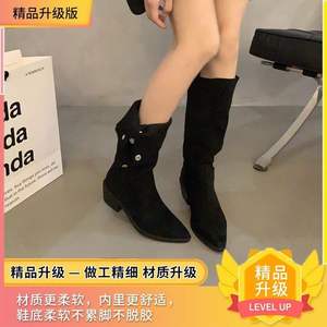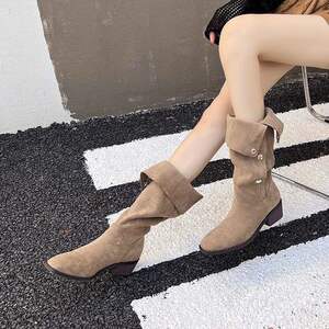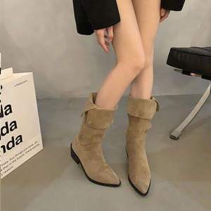 女性用ポインテッドトゥパイルブーツ、厚底ウエスタンカウボーイブーツ、2025春秋夏新作シングルブーツ、ミッドカーフハイヒールショートブーツ
