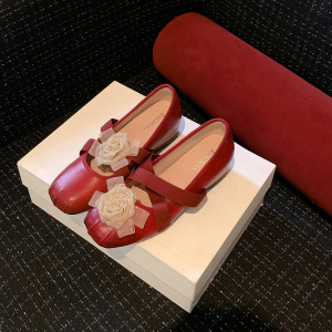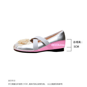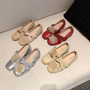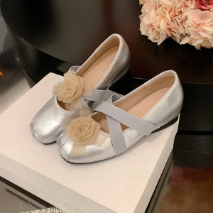 身長を5cmアップする女性用カメリアフレンチ浅口バレエシューズ、万能ラウンドトゥソフトソールシルバーメリージェーンシューズ