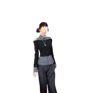 春季美式复古撞色拼接假两件衬衫女春季新款小众收腰修身露肩上衣